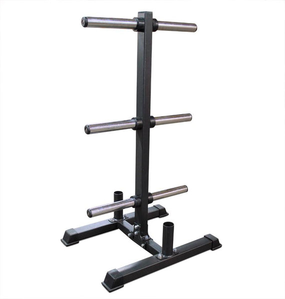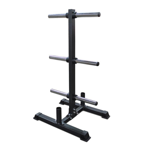 The pegs can hold 4 to 5, 45 lb bumper plates and several 10 lb, 15 lb, or 25 lb.